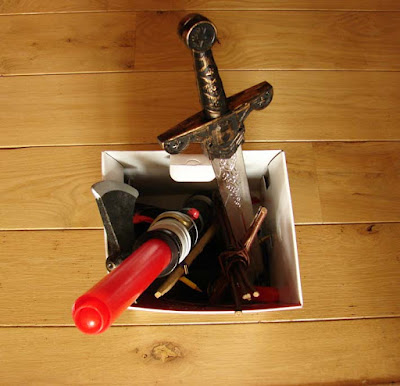 A syn logicznie gromadzi broń do walki z przyszłymi przeciwnościami. Cieszy mnie to, że podzielił na białą i "inną" (różdżka Harrego Pottera spoczęła za to w koszyczku wielkanocnym).